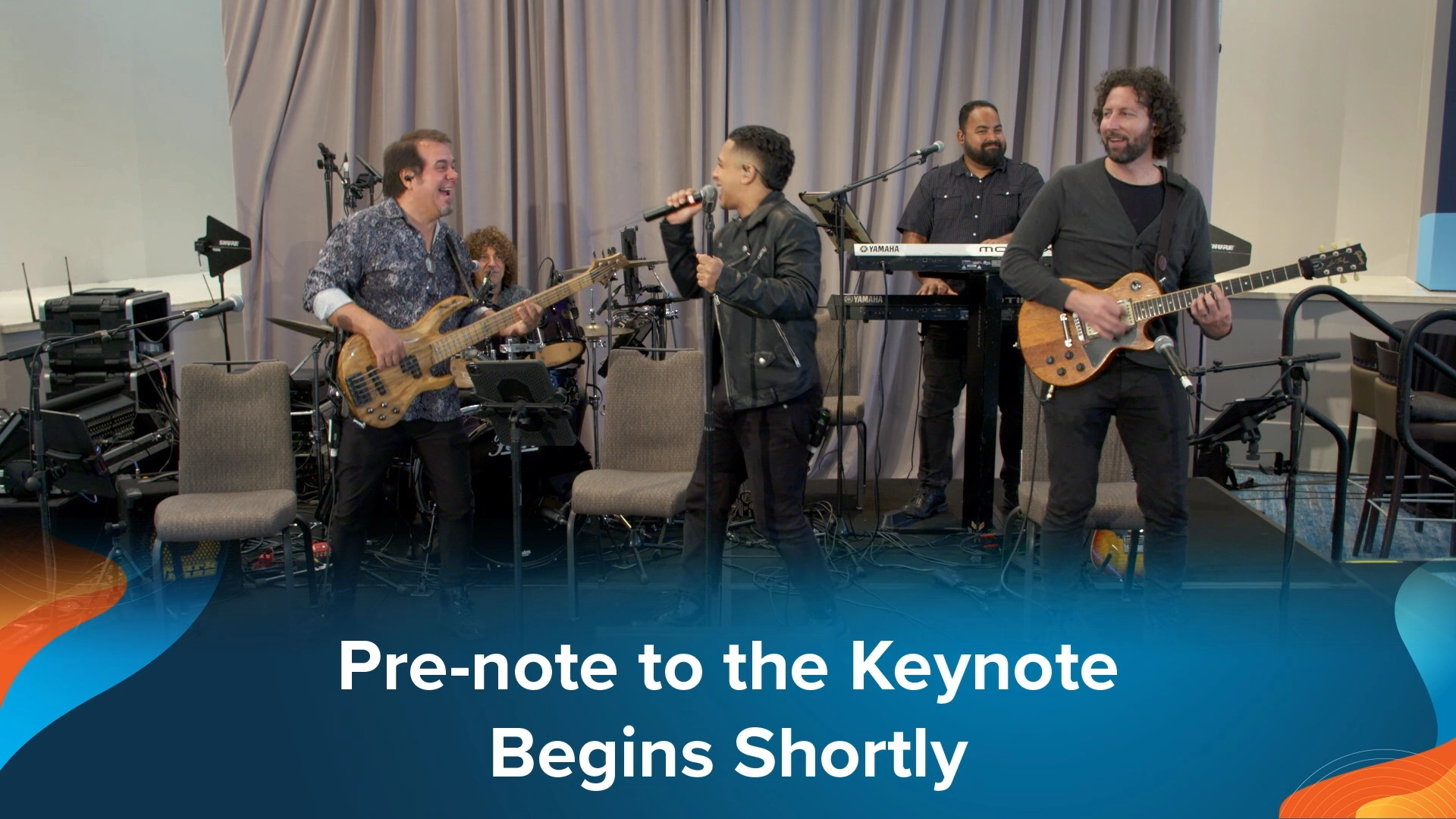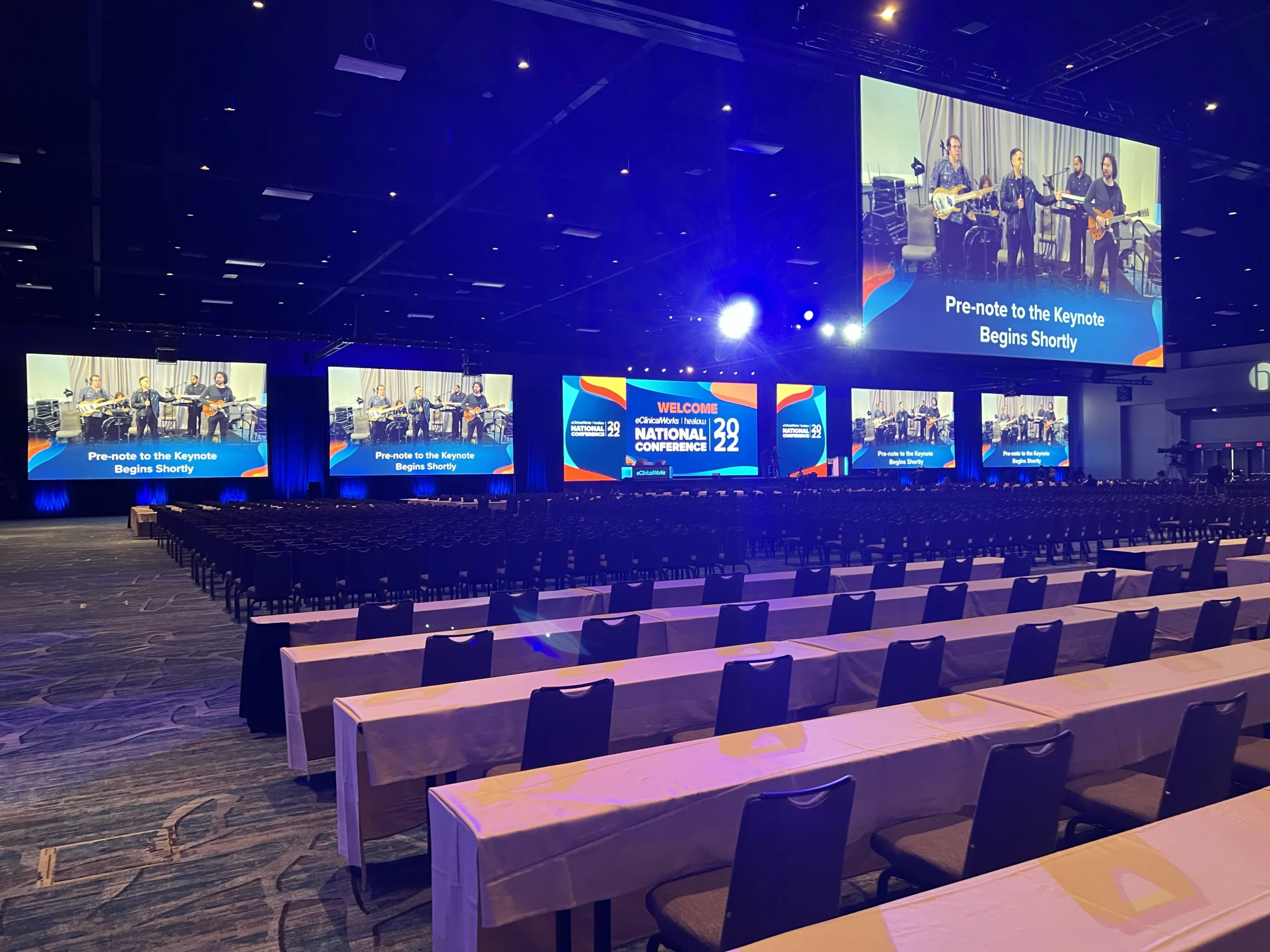 The “Pre-Note to the Keynote” is a live talk show (complete with house band) that takes place prior to the opening keynote of the conference. Utilizing two stages setup in the hallway outside the main ballroom, we provided full-service technical production to produce a live program that was broadcast globally via Microsoft Teams Live and also projected onto screens in the ballroom for attendees to watch. CRMG provided a director, who worked with eClinicalWorks to develop the show flow, spearhead rehearsals, and direct the live show, as well as a full broadcast team including camera operators, audio engineers, graphics operators, and a stream engineer.