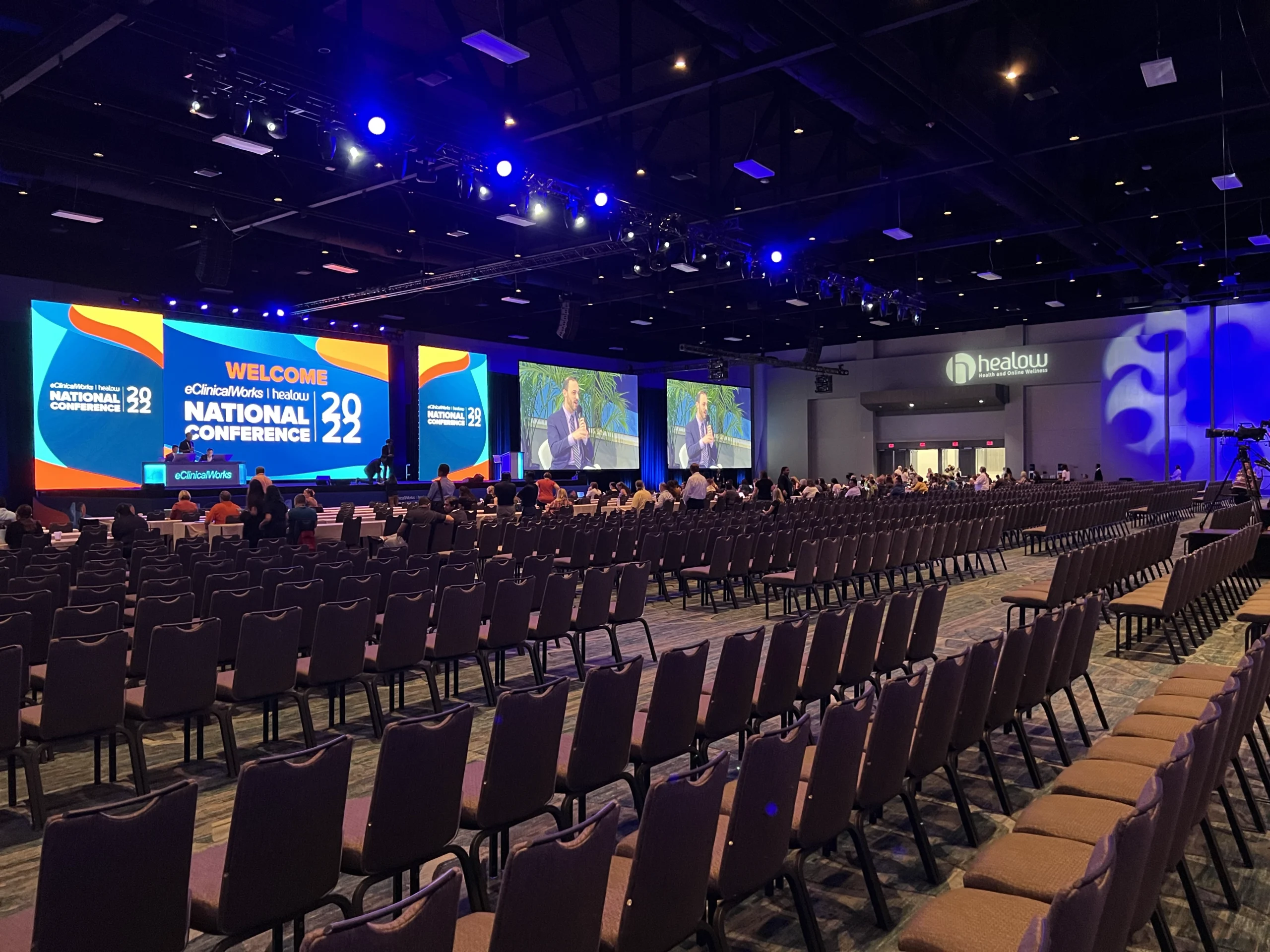 As the houseband played us out of the pre-note, the keynote started up in the main ballroom. We provide live stream engineering services in collaboration with eClinicalWork’s production partners to record and broadcast the keynote online. CRMG edited and packaged the Keynote into digestible modules for distribution following the conference.